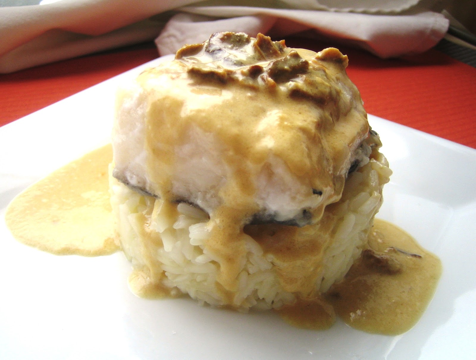 55. Bacallà amb crema de ceps sobre llit d'arròs