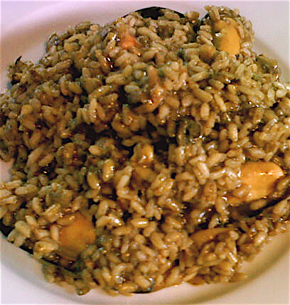 9. Tirem l'arròs i el rostim dos minuts. Afegim el fumet i tota la resta de ingredients.