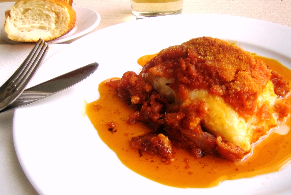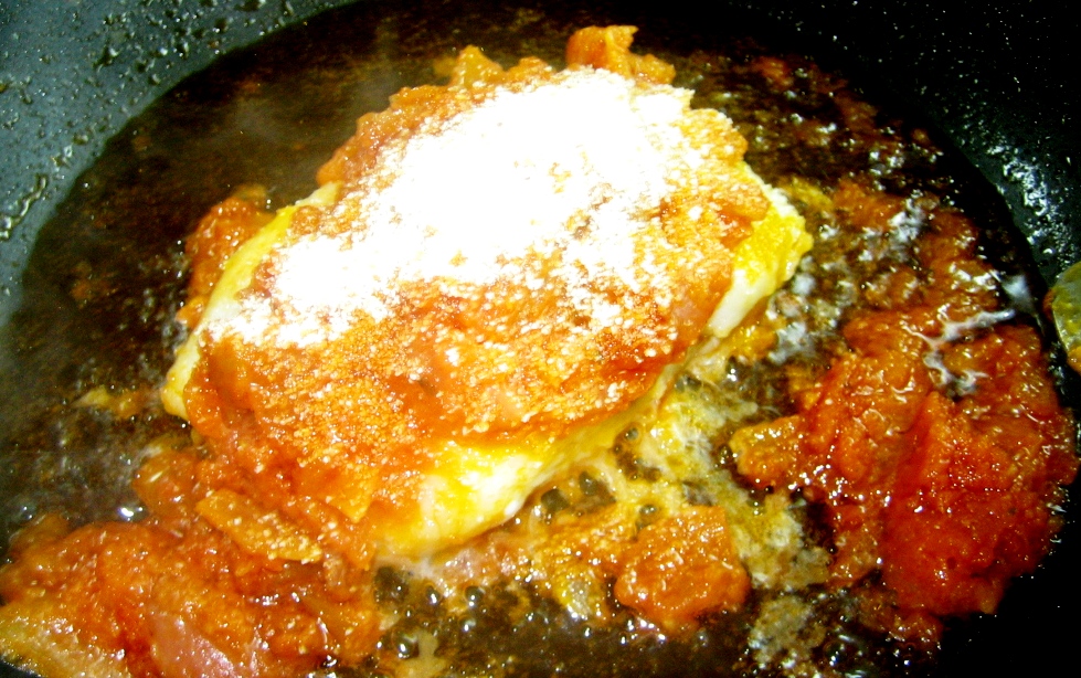- A continuació piquem el tomàquet i piquem els alls. Fent servir el mateix oli, sofregim els alls i hi afegim el pebre dolç. Afegim el tomàquet. Ho deixem sofregir a foc lent afegint-hi sal, pebre i sucre.