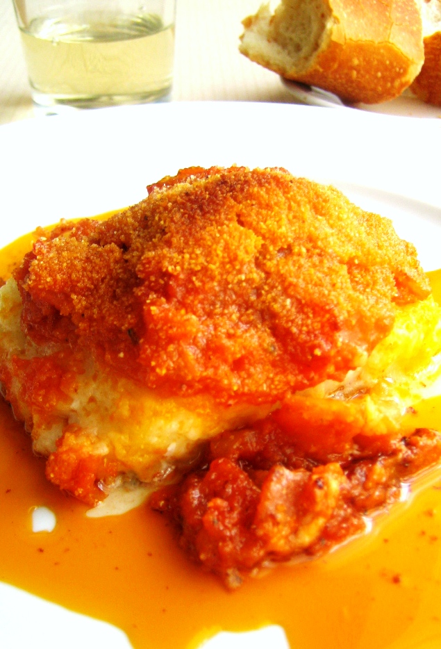 - Tirem el sofregit per sobre dels trossos de bacallà, repartim per sobre el pa rallat barrejat amb la picada d'all i julivert.
