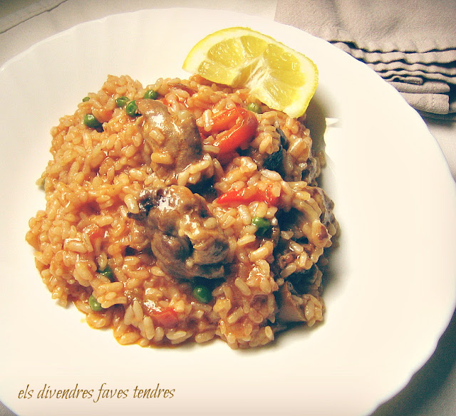 - Tirem l'arròs i pèsols donem unes voltes, afegim el brou o aigua.